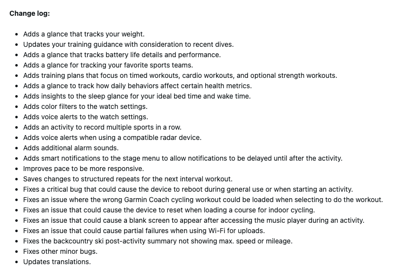 Ändringsloggen (skärmdump nedan) listar många ändringar, men vissa av dessa ingick i äldre versioner. Nytt med betaversion 16.28 är fler alarmljud och möjligheten att fördröja aviseringar till efter en aktivitet, tack vare att de lagts till i scenmenyn. Dessutom har Garmin Connect Mobile Translations uppgraderats till version 3.50.
