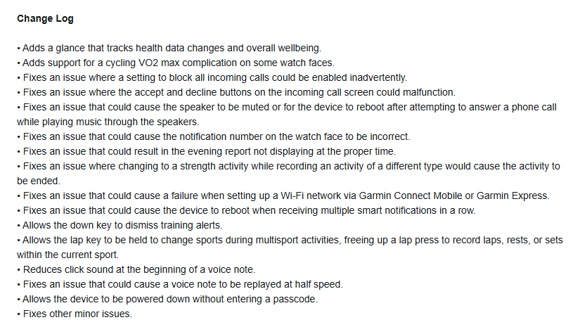 Efter installation av betaversion 15.07 kan användare av smartklockorna Forerunner 570 och Forerunner 970 använda nedåtknappen för att avvisa träningsvarningar, hålla in varvknappen för att växla mellan sporter under en multisportaktivitet och stänga av enheten utan lösenord. Utöver detta finns det ett brett utbud av buggfixar som hanterar problem kopplade till inkommande samtal, kvällsrapporten och styrkeaktiviteten. Garmin uppger också att de har minskat klickljudet som spelas upp i början av ett röstmeddelande. Du kan hitta en skärmdump av den fullständiga ändringsloggen nedan.