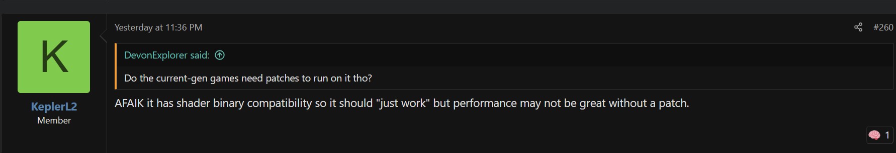 På frågan om "nuvarande generationens spel behöver korrigeringar" för att köras nativt på PS6 Portable, hävdade @Kepler L2 att den handhållna PS6-konsolen kan köra PS5-spel utan någon utvecklarinmatning eller korrigeringar. Detta beror på att PS6 Portable påstås ha "shader binär kompatibilitet", vilket gör att konsolen kan köra PS5-spel nativt.