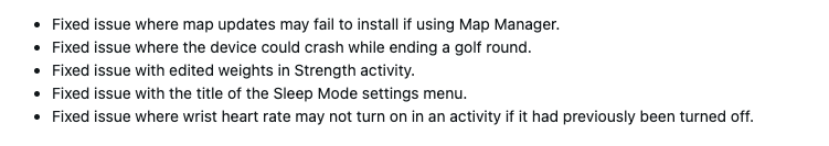 Utöver detta finns det en fix för titeln på inställningsmenyn för viloläge. Dessutom har Garmin tagit itu med ett problem där pulsmätning vid handleden inte startade automatiskt när den tidigare hade inaktiverats för en viss aktivitet.