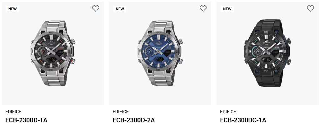 Casio har lagt till tre Edifice Sospensione ECB-2300-referenser på sin internationella webbplats: ECB-2300D-1A, ECB-2300D-2Aoch ECB-2300DC-1Avilket tyder på en bredare lansering utanför Japan. Dedikerade produktsidor för de rostfria modellerna (D-1A, D-2A) och den svarta versionen (DC-1A) finns nu på den globala webbplatsen