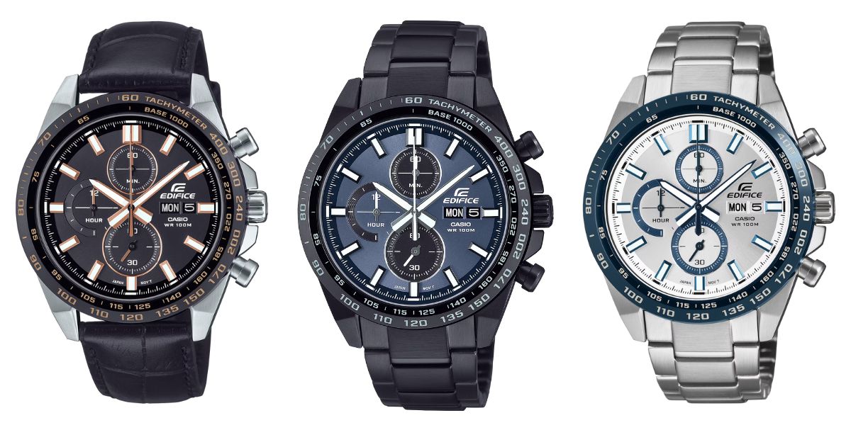 De nya Casio Edifice EFR-574-kronograferna är EFR-574BL-1AV, EFR-574DC-2AV och EFR-574DE-7AV. Dessa klockor har jonpläterade tachymeterbräden, med hölje och armband i rostfritt stål. Den analoga modellen har tre visare för tim-, minut- och stoppursekunder samt en trio infällda visare som är kopplade till stoppursfunktionen. Dessutom finns dag- och datumvisning på urtavlan och dessa klockor är vattentäta till 100 m.
