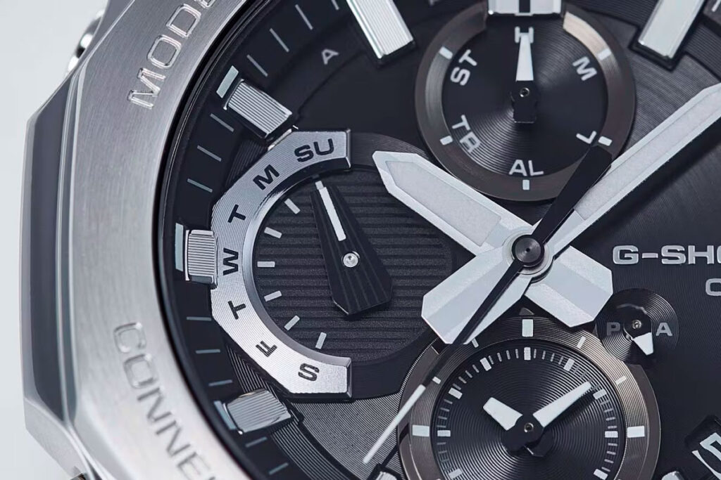 Det är på urtavlan som de flesta synliga förändringarna finns. Layouten är analog med tre underindikatorer, men texturerna är mer uppenbara här. Den huvudsakliga urtavlan ser ut att vara skiktad, med en blandning av radiell borstning och mönstrade sektioner. Dagindikatorn vid klockan 9 har en utskuren display, medan sekundärvisarna har kontrasterande finish. Handdesignen blir också mycket tydligare i dessa renderingar. Kontrasten mellan visarna och urtavlan ser något återhållsam ut, vilket kan påverka synligheten beroende på belysning, även om det är svårt att bekräfta enbart utifrån renderingarna.
