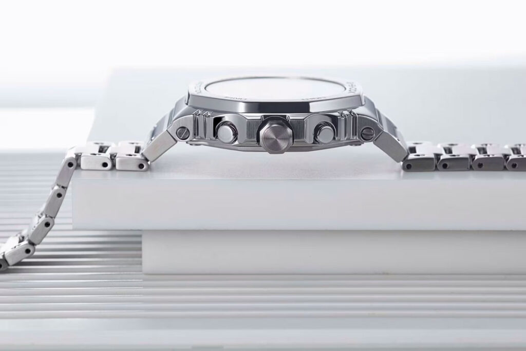 En sidoprofilvy är också tillgänglig. Klockan har enligt uppgift en flerdelad konstruktion med synliga övergångar mellan boetten, boettens mitt och boettens baksida. Kronan och tryckknapparna är proportionellt stora och något upphöjda, men det är ingen överraskning.