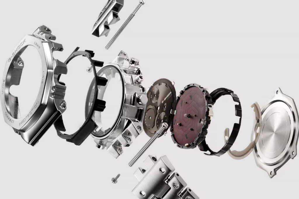 Boetten och armbandet i rostfritt stål är nu synliga från flera vinklar. Ramen har en konsekvent borstad yta, och boettens kanter och länkar verkar mycket skarpare än i den tidigare renderingen. Den övergripande profilen ser ut att vara relativt tunn för en G-Shock i metall, och proportionerna ser ganska lika ut som befintliga GMC-B2100-modeller, bara genom bilder.