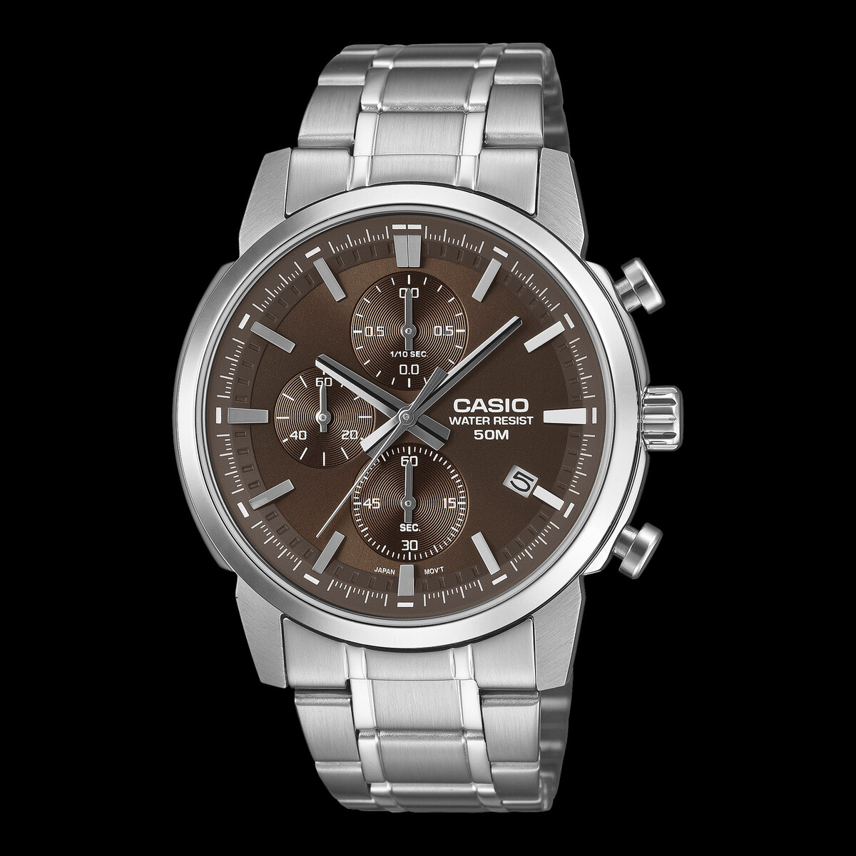 Utöver den grundläggande tidtagningen får du en exakt kronograf med 1/10 sekunders noggrannhet. Sekundvisarna visar minuter vid klockan 9, sekunder vid klockan 6 och tiondelar av en sekund vid klockan 12. Återigen är detta ovanligt för Casios Standard-serie, vilket bidrar till att MTP-E510D har ett eget designspråk som skiljer sig från kvartsklockor i nybörjarsegmentet. Det är dock värt att betona att detta inte är några premiumklockor. Boetten och armbandet i rostfritt stål (med icke-solida länkar) håller kostnaderna nere utan att ge avkall på utseendet av robusthet. Måtten är en medelväg på 47,5 × 42 × 10,5 mm - vilket innebär att dessa klockor bör passa de flesta handleder utan att se överdimensionerade ut.