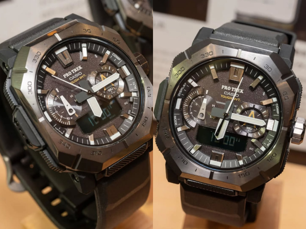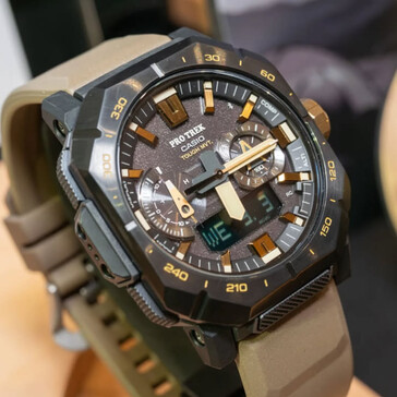 Även i dessa IRL-bilder är PRW-B1000:s hybrid analog/digital urtavla synlig, med tydliga indikationer för kompass-, termometer- och barometerfunktioner, som alla ingår i Casios etablerade Triple Sensor-svit. Bluetooth-appanslutning och solcellsladdning bekräftas också av det officiella materialet. Klockan har atomtidtagning (Multi-Band 6) och en boettstorlek som mäter ungefär 50,8 x 48,5 x 14,9 mm.