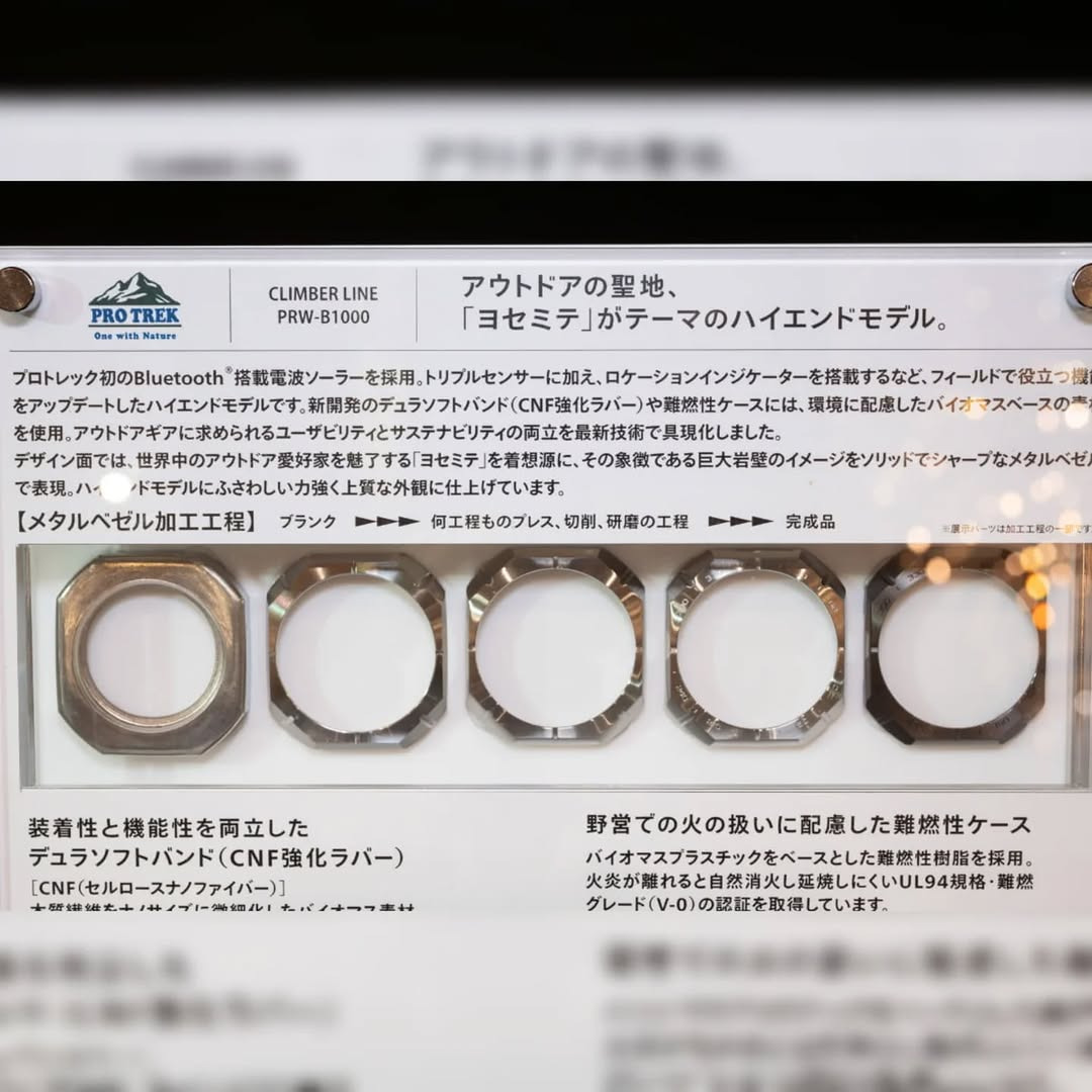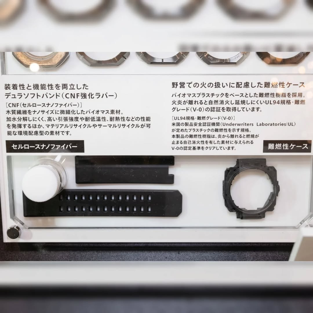 Utställningen visar också Casios användning av cellulosa nanofiber (CNF) förstärkt gummi för armbandet för överlägsen slitstyrka och miljövänlig bioplastintegration. Särskild displaytext belyser klockarmbandets och boettens flamskyddade certifiering, som uppnåtts genom att använda material av UL94 V-0-kvalitet - viktigt för säker användning på fältet.