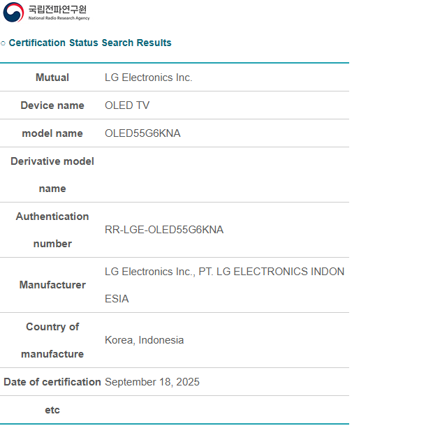 Nyligen, DisplaySpecifications lG C6- och G6-TV-apparaterna i databasen för National Radio Research Agency (NRRA) i Sydkorea. Här är 55-tumsstorleken på var och en listad som certifierad för försäljning på denna marknad. Dessa modeller förväntas erbjudas i en rad olika storlekar. Som jämförelse kan nämnas att 2025 C5 finns tillgänglig i 42, 48, 55, 65, 77 och 83 tum, medan G5 kan köpas som en 55, 65, 77, 83 eller 97-tums TV.
