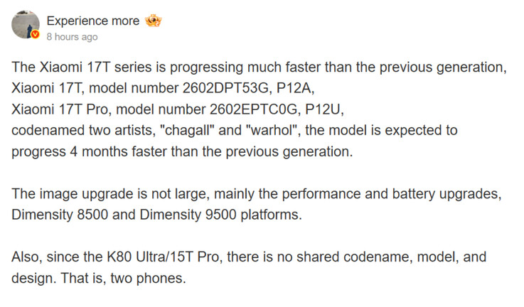 Istället hävdar de att Xiaomi 17T Pro och Redmi K90 Ultra är två distinkta smartphones. Genom att skriva på Weibo förväntar sig Experience more att både Xiaomi 17T Pro och Xiaomi 17T är "fyra månader före den föregående generationen. Därför kan vi se Xiaomi 17T-serien göra sin globala debut i mitten till slutet av maj 2026 snarare än september 2026.