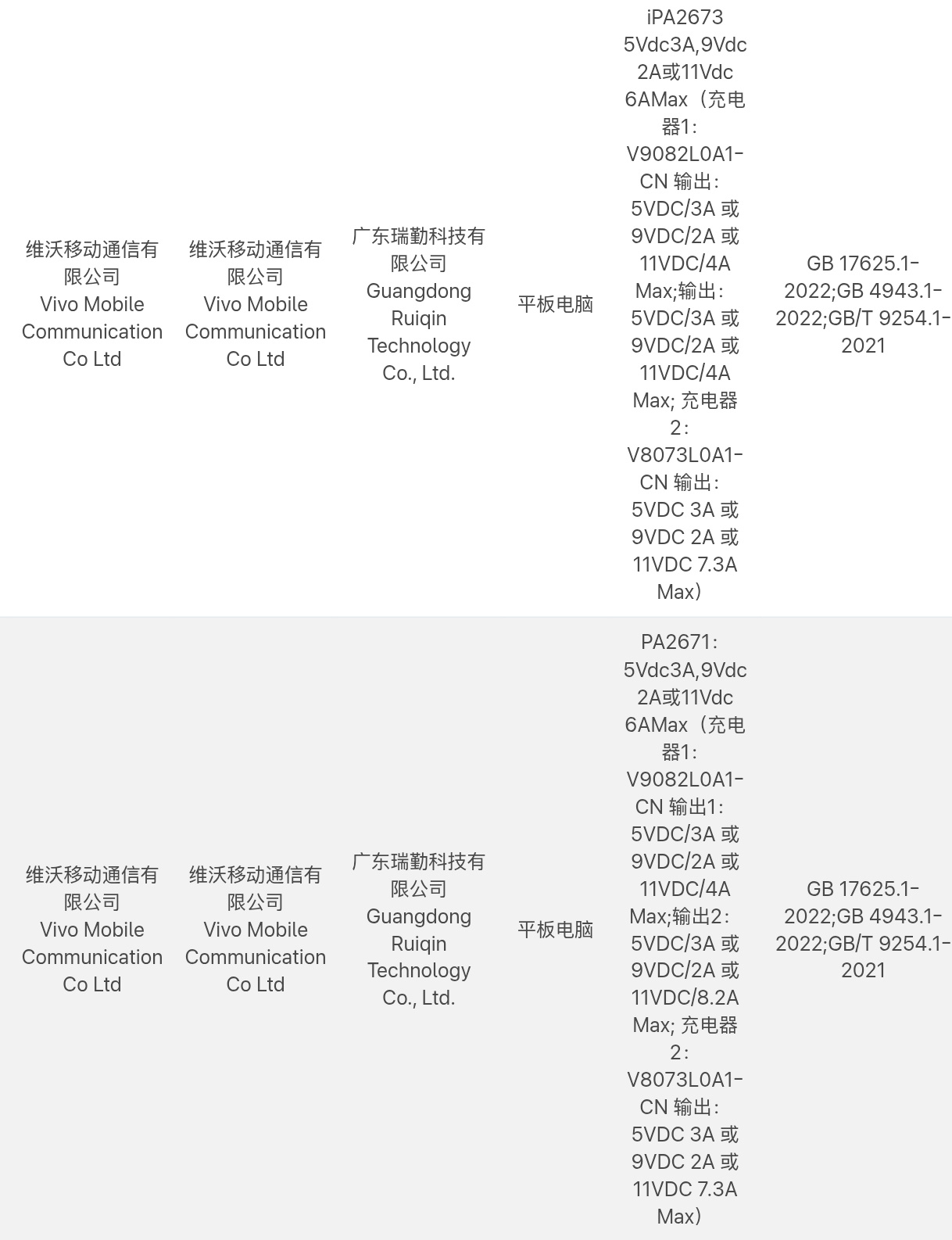 Specifikt utvecklar företaget iPA2673 och PA2671, som skärmdumpen nedan visar. Baserat på data från CCC stöder båda surfplattorna drygt 80 W trådbunden laddning vid 7,3 A/11 V. Enbart från denna laddningseffekt har Digital Chat Station dragit slutsatsen att iPA2673 och PA2671 är modellnumren för iQOO Pad6 Pro och Vivo Pad6 Pro.
