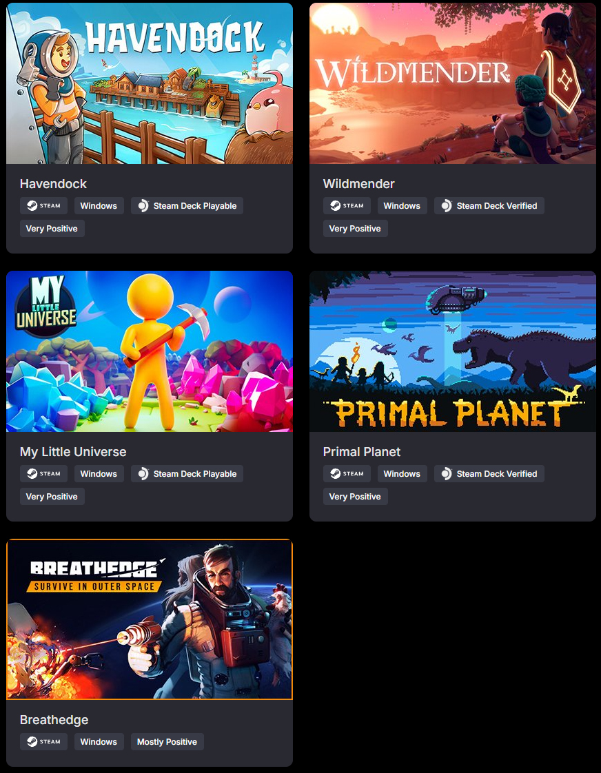 - Breathedge - ett överlevnadsspel i en öppen värld med hantverksmekanik och bra övergripande spelarmottagning. Det är märkt som Steam Deck Unsupported, men körs bra på spelhandhållaren med några tweaks. Detaljhandelspriset är $ 24,99, och den lägsta tiden är $ 6,24.