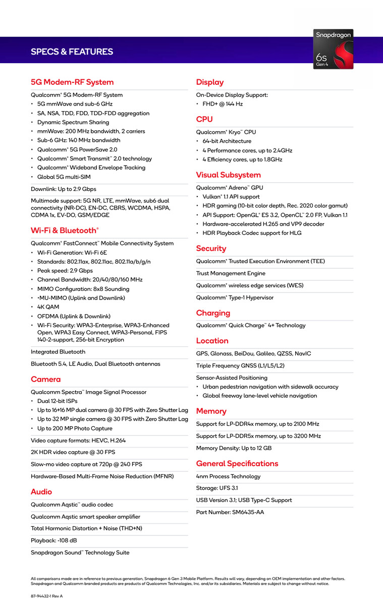 Logiskt sett skulle den jämförelsen vara med Snapdragon 6s Gen 3 som Snapdragon 6s Gen 4 borde ersätta. Men artikelnumret "SM6435-AA" indikerar att Snapdragon 6s Gen 4 är en släkting till Snapdragon 6 Gen 1 (SM6450) som finns i flera smartphones som Honor Magic 7 Lite och Moto G Stylus 5G 2024 (curr. $ 199 på Amazon).