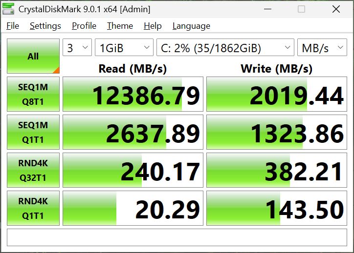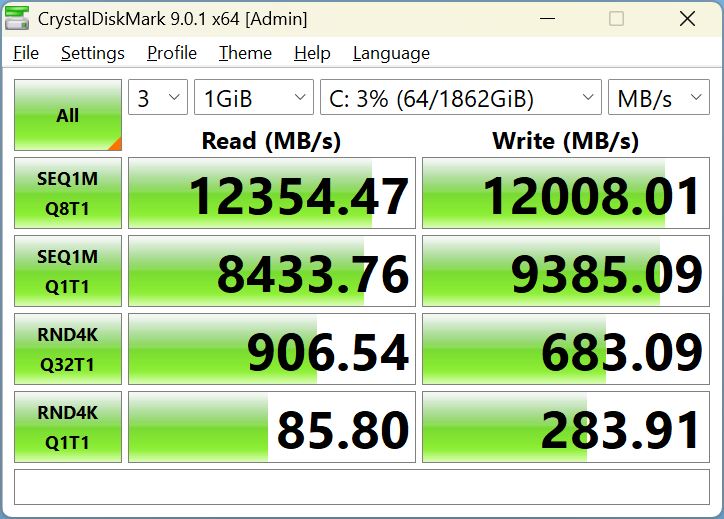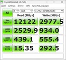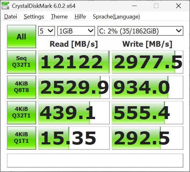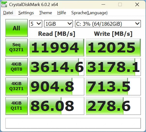 Vid det andra försöket ser resultaten mycket bättre ut: enligt CrystalDiskMark 6 når enheten nästan 12.000 MB/s i både läs- och skrivhastigheter - ett imponerande resultat. CrystalDiskMark 9 visar till och med något högre siffror, medan AS SSD är lite mer återhållsam.