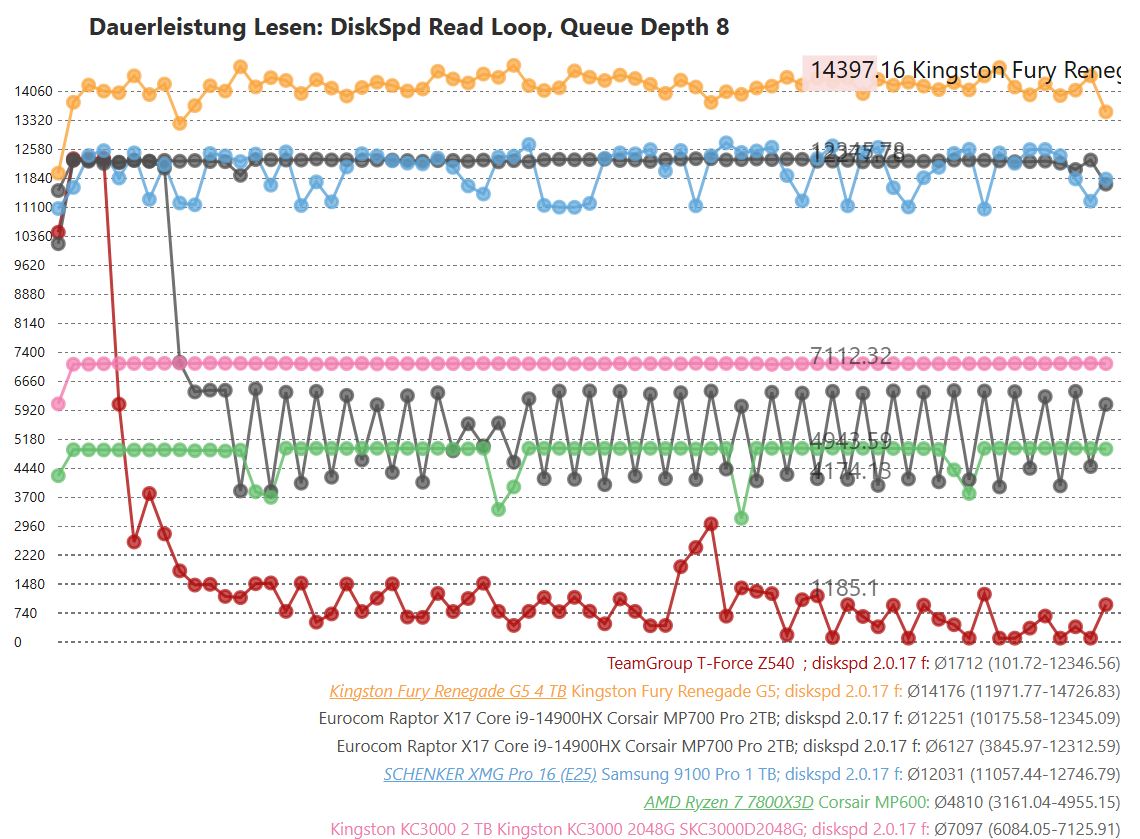 I vårt uthållighetstest med DiskSpd höll T-Force Z540 också genomgående hög prestanda. Den matchar inte riktigt hastigheten på Kingston Fury Renegade G5men resultaten är fortfarande anmärkningsvärt starka