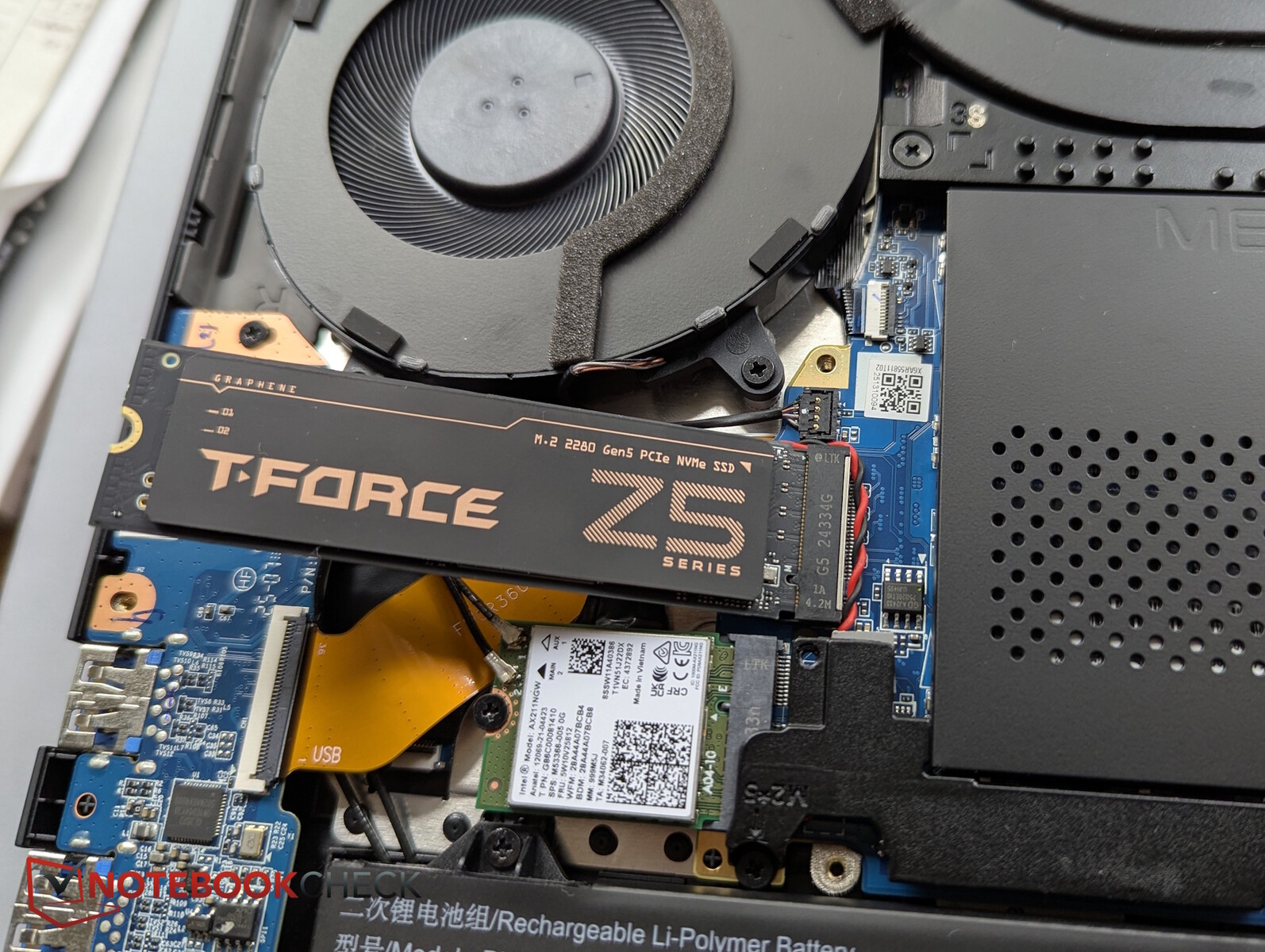 Så vi tar bort den bärbara datorns huvudminne och sätter in vår T-Force Z540. Inledningsvis utelämnade vi XMG:s kylplatta - som normalt ansluts till chassit via en extra värmedyna - och förlitade oss enbart på det medföljande grafenklistermärket för kylning.
