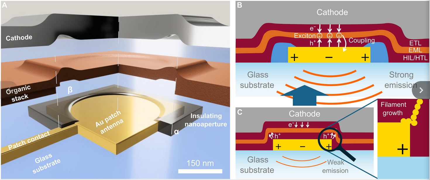 De tyska forskarna publicerade sina resultat i tidskriften Science Advances, där de konstaterar att pixeln på 300 nm² avger orange ljus och är lika ljusstark som en konventionell OLED på 5 nm². Att helt enkelt krympa den ljusemitterande dioden skulle dock inte ge tillförlitlig effektivitet. Forskarna behövde implementera en guldkuboidantenn som mätte 300 x 300 x 50 nm och var också tvungna att se till att de elektriska fältströmmarna inte tvingar guldatomerna att förgrena sig ut i det optiskt aktiva materialet och så småningom kortsluta hela pixelstrukturen. För detta ändamål har forskarna konstruerat ett isoleringsskikt ovanpå antennen, vilket lämnar en cirkulär öppning med en diameter på 200 nm i mitten av antennen.