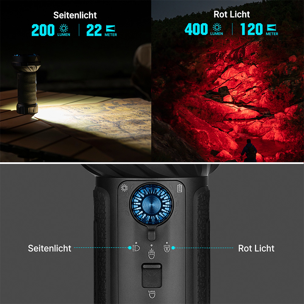 Ficklampan har flera reglage, bl.a. en vridknapp, en väljare på vridknappen som kan skjutas i sidled och en skjutknapp som styr strålkastare, spotlight och kombinerat läge. Det senare fungerar inte när det röda ljuset eller sidoljuset är tänt. Den roterande ratten fungerar också som strömbrytare.
