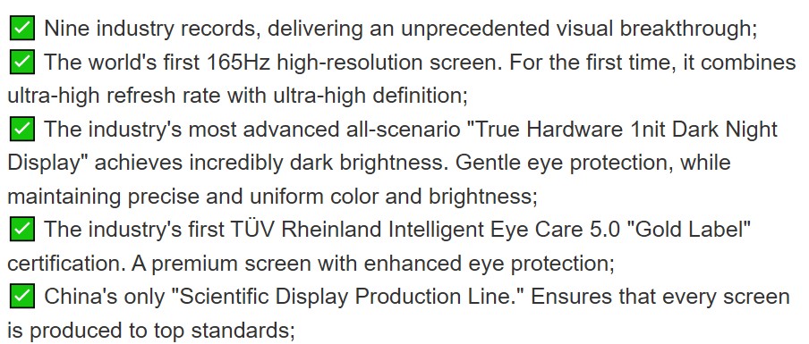 På grund av begränsningar i självlysande material och kretsteknik kan industrin för närvarande inte uppnå 165 Hz- och 2K-specifikationerna samtidigt. 165Hz + 1,5K X3-skärmen är den optimala lösningen och en höjdpunkt inom displaytekniken för mobiltelefoner. Tidigare var den högsta upplösningen för 165 Hz-skärmar med ultrahög uppdateringsfrekvens på mobiltelefoner endast 1080p. Denna X3-skärm är branschens första 165Hz + 1,5K-skärm. Efter år av marknadsvalidering är 1,5K-skärmar nu en utmärkt balans mellan förstklassig skärmkvalitet och energieffektivitet på många flaggskeppstelefoner från stora varumärken, så det finns ingen anledning att oroa sig för den faktiska upplevelsen. För det andra erbjuder den ultrahöga uppdateringsfrekvensen på 165 Hz en oöverträffad smidig upplevelse och är framtiden för mobiltelefonskärmar.