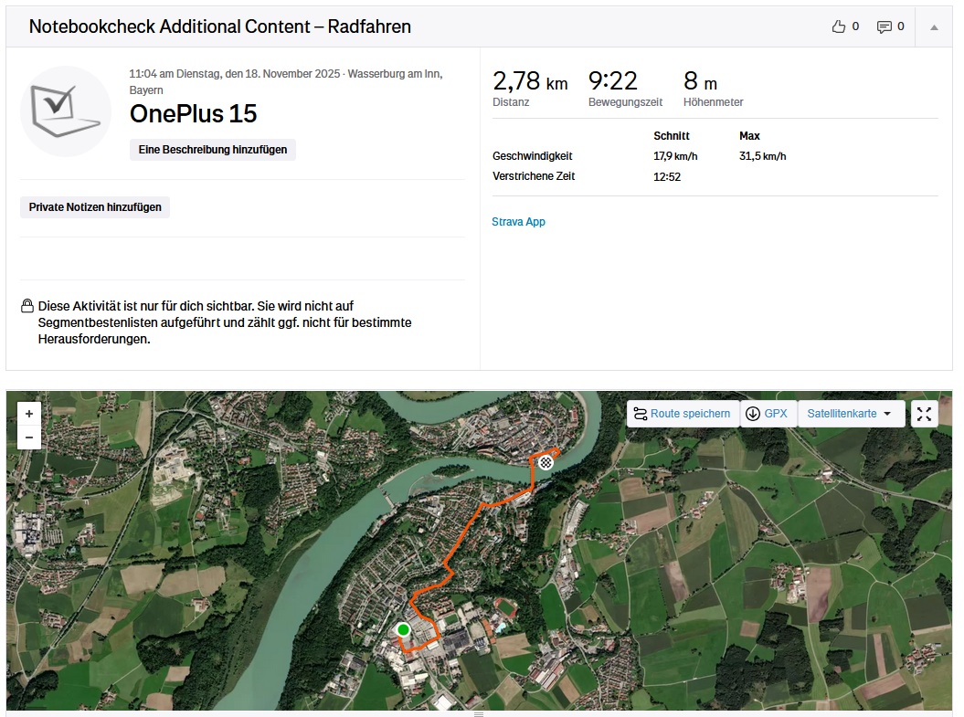 Båda enheterna beräknade exakt samma avstånd, och OnePlus 15 representerade vår rutt exakt. På bron placerades vi några meter från vår faktiska väg, men totalt sett är telefonen mycket väl lämpad för navigering och platsspårning.