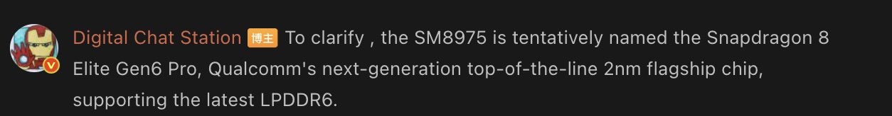 Den framstående tipsaren Digital Chat Station har nu avslöjat att OnePlus 16 kommer att ha ett chipset med kodnamnet SM8975, som enligt uppgift tillhör Snapdragon 8 Elite Gen 6 Pro. Det förväntas vara ett 2nm-baserat chipset som kan uppnå en 5 GHz klockhastighet. Framför allt ryktas det att stödja LPDDR6 RAM, jämfört med LPDDR5X RAM på 8 Elite Gen 5.