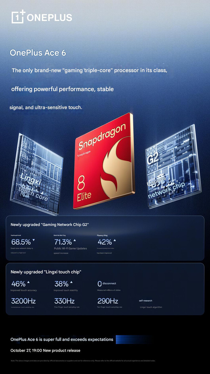 Nu har OnePlus bekräftat att Ace 6 förlitar sig på Qualcomms Snapdragon 8 Elite chipset, precis som OnePlus 13 före den. Dessutom har Ace 6 en uppgraderad Gaming Network Chip G2, som OnePlus hävdar ger bättre mobil- och Wi-Fi-prestanda än tidigare exempel. På samma sätt har enheten ett Lingxi Touch Chip för att maximera pekskärmens respons när du spelar.
