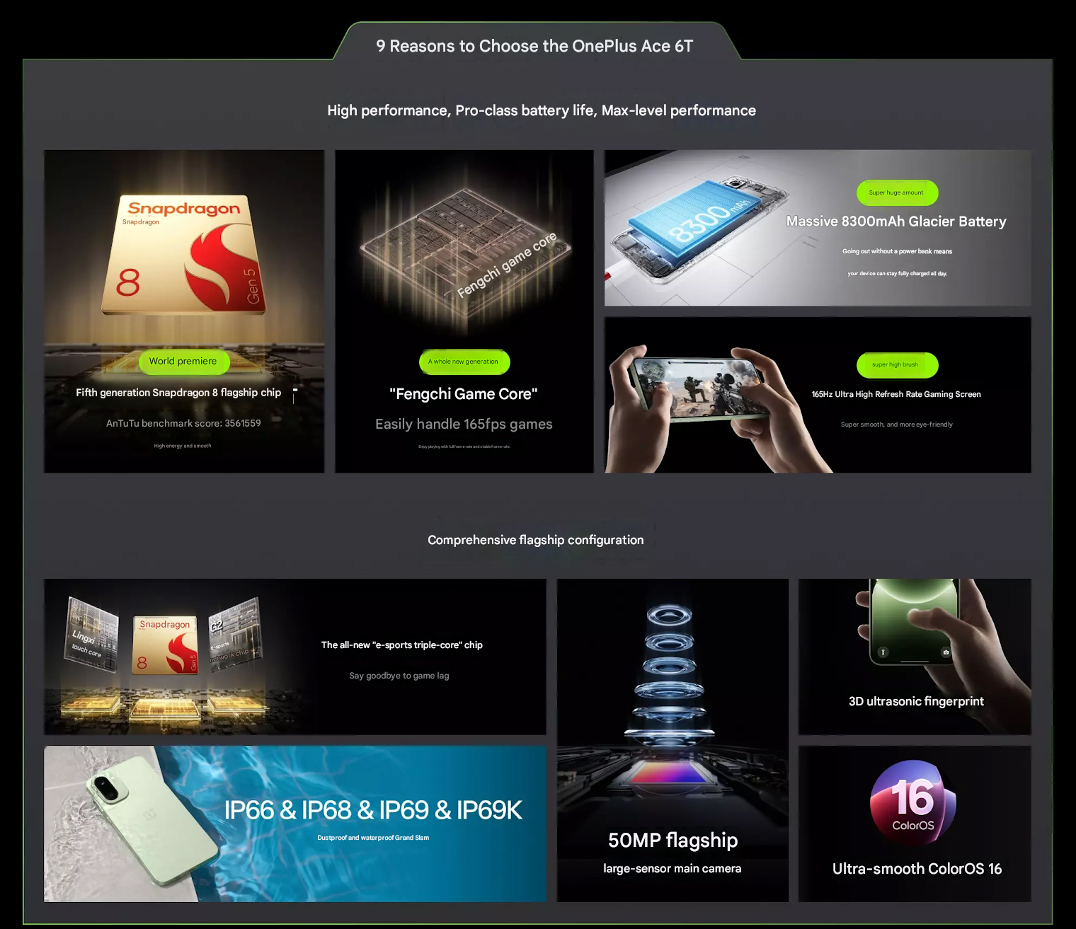 Andra höjdpunkter i telefonen inkluderar en dubbelkamera på baksidan med en 50 MP primär sensor, upp till 16 GB LPDDR5X RAM och 1 TB UFS 4.1 lagring, och stöd för WiFi 7. I Kina har Ace 6T ett startpris före försäljning på CNY 2 599, cirka $ 367. Telefonen kommer att lanseras som OnePlus 15R på den globala marknaden den 17 december 2025.