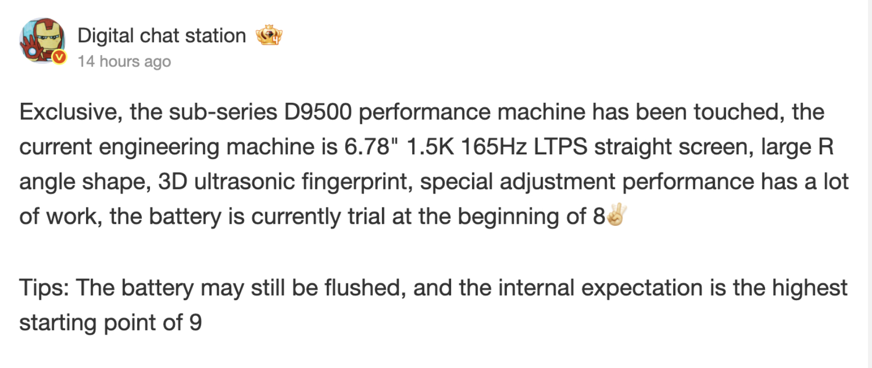 Förmodligen kommer MediaTek att marknadsföra detta chip som Dimensity 9500 Plus, med Ace 5 Ultra som har utnyttjat Dimensity 9400 Plus förra året. Dessutom tillägger Digital Chat Station att den icke namngivna enheten kombinerar detta chipset med en 6,78-tums OLED-skärm som matar ut vid 1,5K med en 165 Hz uppdateringsfrekvens men utan verkligt stöd för variabel uppdateringsfrekvens.