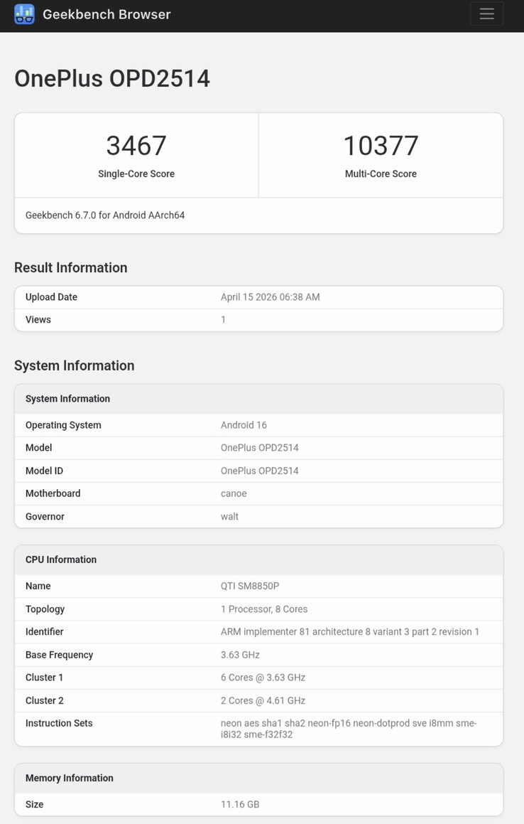 Icke desto mindre har vad som verkar vara OnePlus nya surfplatta nu dykt upp på Geekbench. Inbäddad nedan, en enkelkärnig poäng på 3 467 är i den nedre delen av vad vi har kommit att förvänta oss av Snapdragon 8 Elite Gen 5 chipset. Faktum är att denna tidiga poäng ser den ryktade Pad 3 Pro följa den mindre OnePlus 15. På samma sätt skulle surfplattans flerkärniga poäng på 10 395 placera den näst längst ner i vår Geekbench 6 flerkärniga topplista.