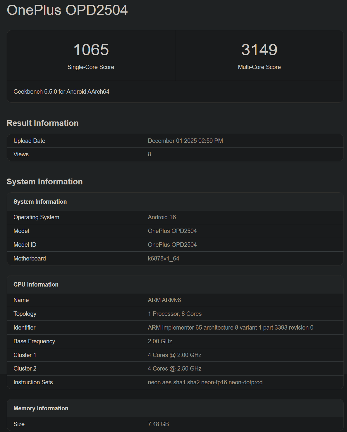 Den kommer med OnePlus OPD2504-namntaggen och vad som ser ut som en MediaTek Dimensity 7300 SoC med fyra P-kärnor på 2,5 GHz, fyra E-kärnor på 2,0 GHz, en Arm Mali-G615 MC2 GPU och 8 GB systemminne. Den får 1065 och 3149 poäng i Geekbenchs single- och multi-core-tester, vilket är i nivå med Dimensity 7300:s genomsnittliga poäng.