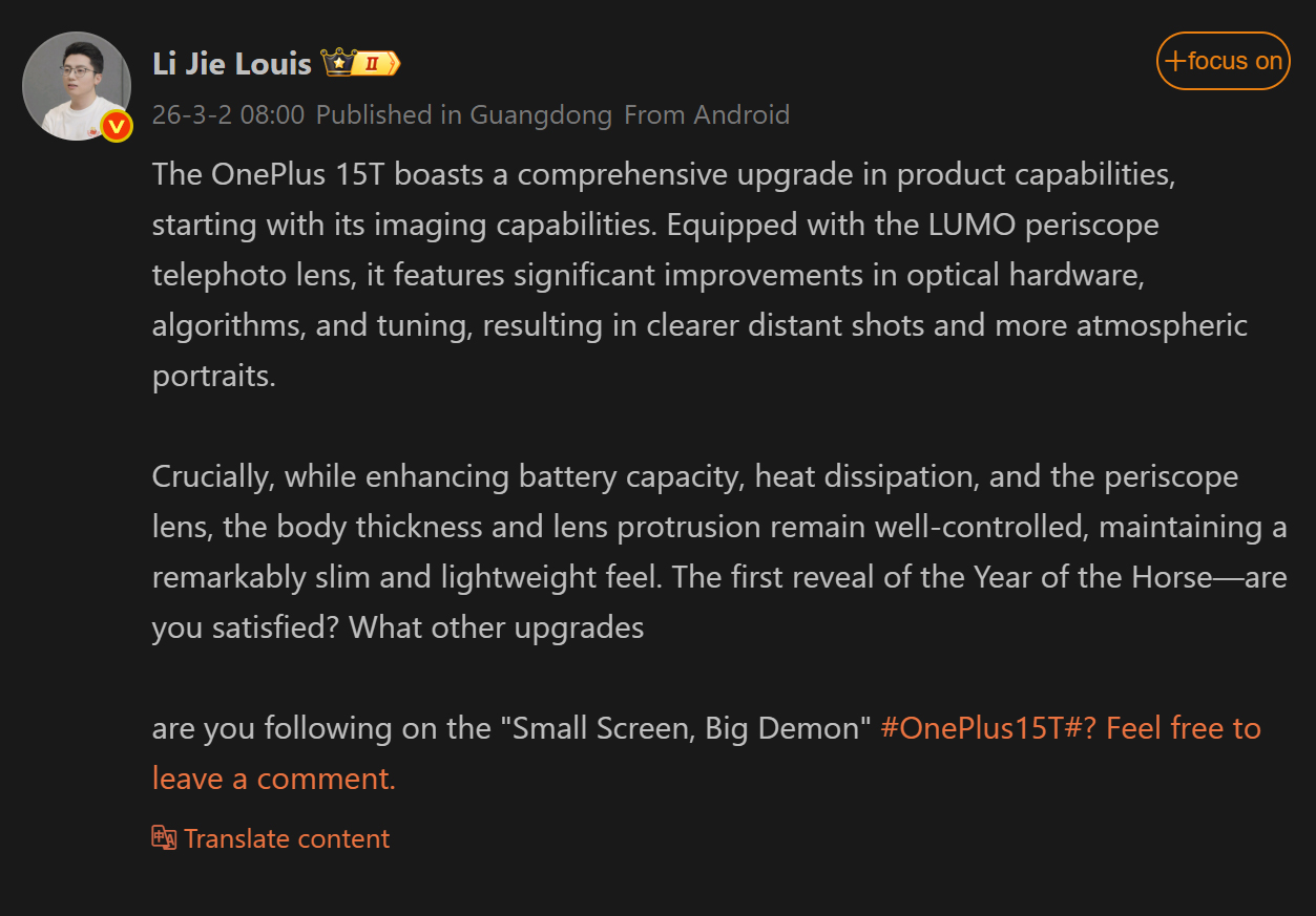 I ett nyligen publicerat inlägg på Weibo berättade Louis att den kommande kompakta telefonen kommer att innehålla LUMO periskop-teleobjektivet. Tack vare uppgraderingen av algoritmen, den optiska hårdvaran och inställningen, kommer OnePlus 15T att erbjuda tydligare fjärrbilder och detaljerade porträtt.