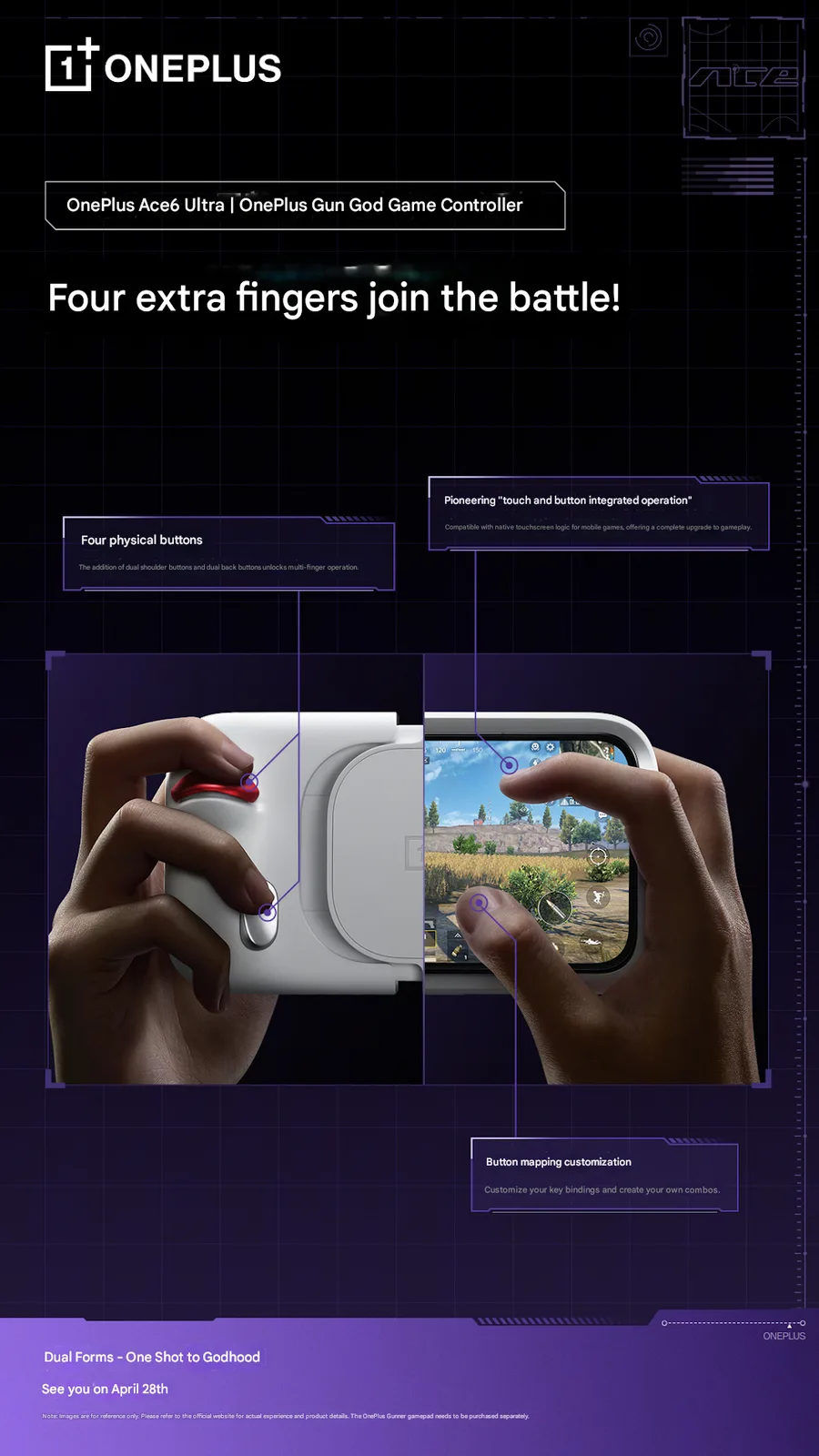 Tillbehöret lägger till fyra fysiska knappar och uppmuntrar till hybridkontroller: touch och knappar. OnePlus visar att med handkontrollen ansluten kan spelare enkelt använda flera fingrar för att spela skjutspel på Ace 6 Ultra. Denna inställning, som videorna visar, gör det lättare att göra komplexa FPS-åtgärder som att kika, sikta, skjuta och kontrollera rekylen samtidigt.