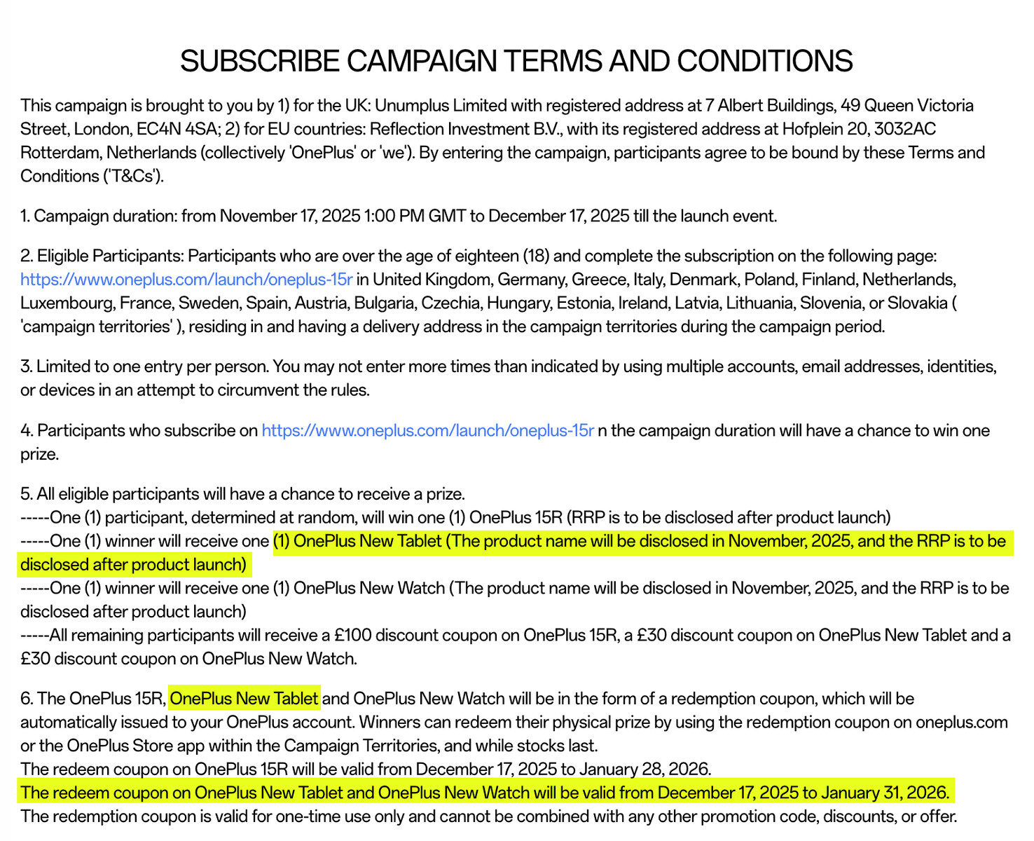 Istället nämner OnePlus en "OnePlus New Tablet" över kampanjvillkoren för sin OnePlus 15R-kampanj. Som skärmdumpen nedan visar kommer OnePlus att avslöja namnet på denna mystiska surfplatta senare denna månad. Dessutom indikerar samma villkor att OnePlus sedan kommer att fortsätta att släppa samma surfplatta på eller runt den 17 december innan dess tidiga fågelkampanj slutar den 31 januari 2026.