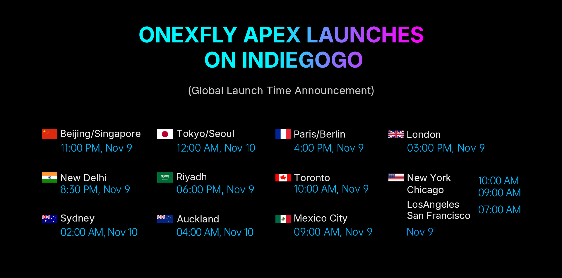 Medan vi väntar på fler nyheter om OneXPlayer Super X, kommer One-Netbook att ta med sin OneXFly Apex spelhanddator till Indiegogo den 9 november. Företaget kommer att påbörja sin crowdfunding-kampanj kl. 15:00 UTC. Vänligen se bilden nedan för lanseringstider i andra tidszoner.