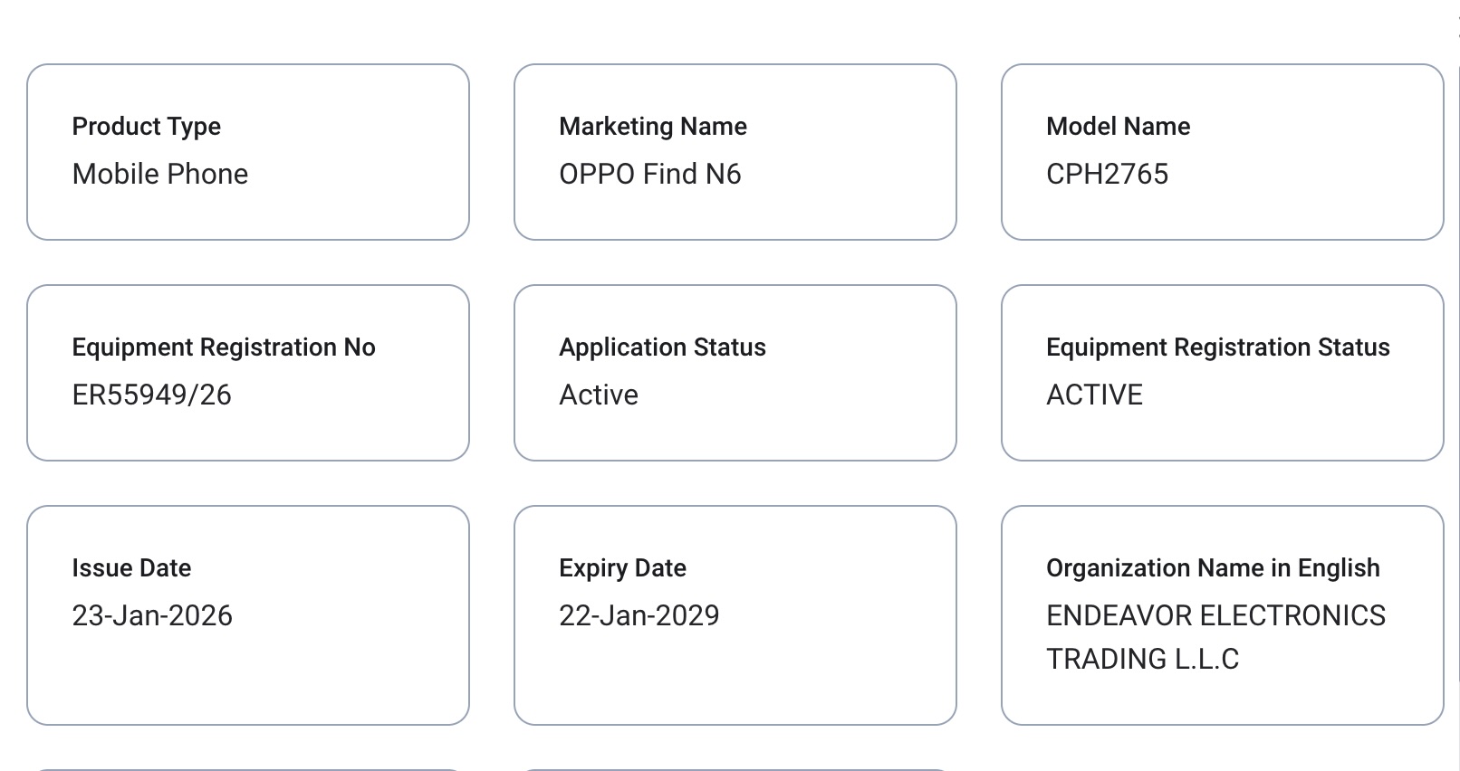 En ny notering på UAE: s TDRA-regleringsorgan bekräftar modellnumret för globala Oppo hitta N6. Till skillnad från den kinesiska modellen, som har modellnumret "PLP110", är den globala varianten listad som "CPH2765"