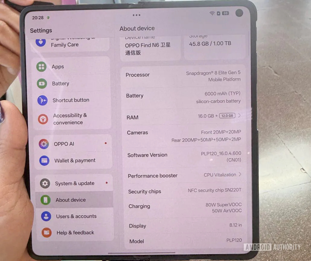 Under tiden har Android Authority kunnat bekräfta flera hårdvaruspecifikationer inför ett officiellt tillkännagivande. Som bilden ovan visar har Oppo utrustat Find N6 med en Snapdragon 8 Elite Gen 5 chipset och upp till 16 GB RAM och 1 TB lagringsutrymme. Baserat på senaste läckornakommer detta att vara den 7-kärniga varianten snarare än det 8-kärniga alternativet som används i Honor Magisk V6 och candybar-smartphones som OnePlus 15 (curr. $ 899 på Amazon).