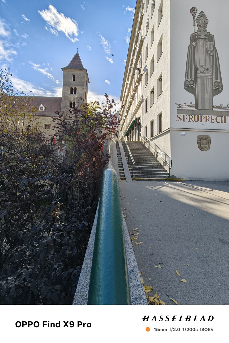 Jag skapade en annan jämförelse av beskärningen med de två bilderna nedan. På bilden av Wiens äldsta kyrka står sig Oppo Find X9 Pro:s ultrabreda objektiv mycket väl mot Vivo i 50MP-kvalitet. Zeiss-kamerans flaggskepp verkar fortfarande något skarpare, men i dagsljus presterar den mindre sensorn på Find X9 Pro imponerande. Scenen under bron visar ett liknande mönster. Vivo-bilden ser lite skarpare ut, kanske till och med lite överskärpt, trots att Oppo-bilden är 25MP. I trappbilden levererar Oppo en något varmare bild, medan Vivo X200 Ultra visar lite mer brus i den inzoomade vyn, vilket är förvånande med tanke på dess större sensor.