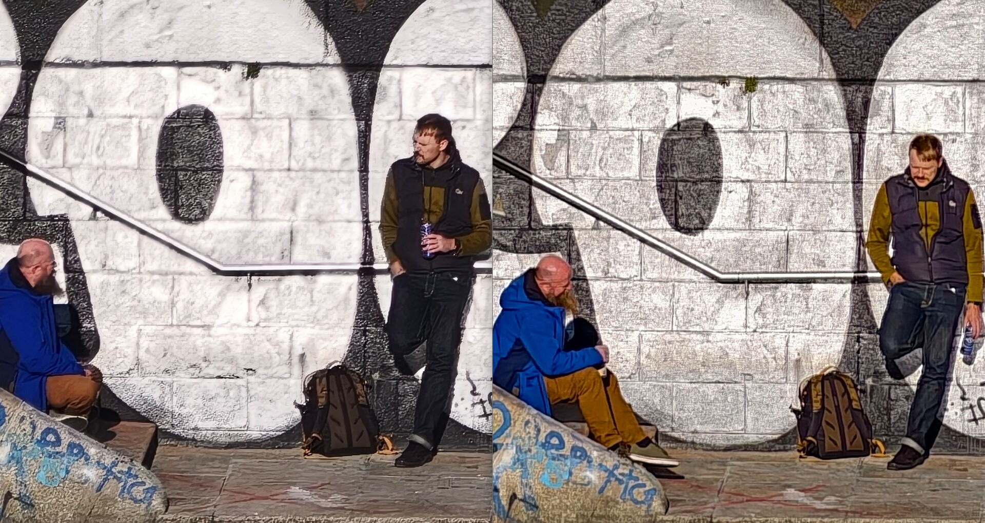 De två personerna i den andra jämförelsen ser mer ut som karikatyrer än verkliga personer, men det är ett vanligt problem med smartphones och blir ännu mer uttalat med AI-bearbetning vid högre zoomnivåer. Väggen i bakgrunden visar en annan skillnad, eftersom Vivos flaggskepp avslöjar fler texturdetaljer, medan Oppo suddar ut det mesta av det, troligen på grund av starkare brusreducering. Det är också intressant hur olika färgerna på ryggsäcken ser ut i den inzoomade vyn. Tyvärr minns jag inte längre vilken version som är mer exakt.