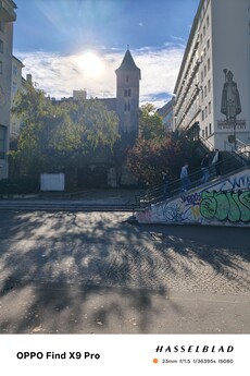 I jämförelsen av gatuscenen med Ringturm i bakgrunden jämförs ett 50MP-foto från 70 mm-teleobjektivet på Oppo Find X9 Pro med ett 12MP-foto från 85 mm-teleobjektivet på Vivo X200 Ultra. Den förväntade skärpefördelen i beskärningsjämförelsen är mindre märkbar än förväntat, även om den fortfarande är synlig. Texten på enkelriktningsskylten ser mer naturlig ut till vänster (Oppo) än till höger (Vivo). Sammantaget verkar Vivo-bilden återigen ha något högre kontrast.