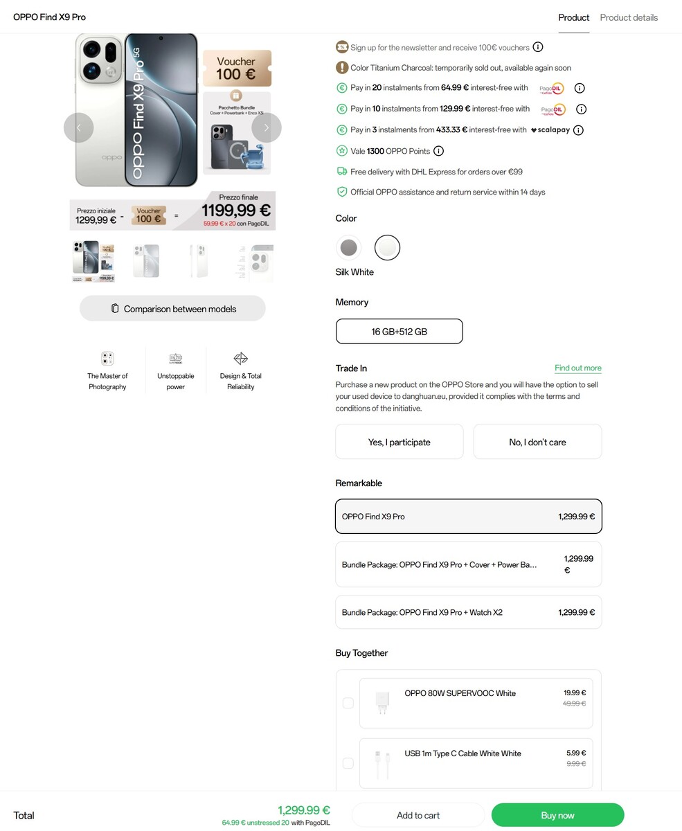 Även om vi inte har hittat några specifika Oppo Find X9-produktsidor i östeuropeiska länder som Ungern, Tjeckien, Bulgarien, Kroatien eller Polen, samt i norra Europa, finns det ett intressant förbeställningserbjudande i Italien. Där kan du få $100 rabatt på Oppo Find X9 Pro när du registrerar dig för nyhetsbrevet och väljer mellan två paketerbjudanden, antingen ett med Oppo Watch X2 eller ett med Enco X3i EarBuds, ett fodral och en powerbank. I Rumänien, å andra sidan, erbjuder Oppo ett utökat paketerbjudande bestående av Oppo Watch X2, en 80-watts laddare och ett skyddsfodral i aramid för 6 500 lei, vilket motsvarar 1 276 euro. Du kan dock inte lägga något i din kundvagn ännu, eftersom leveransen inte börjar förrän i november