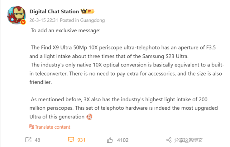 Den välkända läckan Digital Chat Station delade nyligen nya detaljer om Find X9 Ultras kamerahårdvara. Även om dess 10x periskop-teleobjektiv förmodligen inte kommer att vinna några sensortävlingar med en 1/2,76-tums ISOCELL JN5, ryktas kameran ha en relativt stor f/3.5 bländare. Som jämförelse kan nämnas att Samsungs tidigare 10x teleobjektiv - som senast sågs i Galaxy S23 Ultra - använder en betydligt mindre 1/3,52-tums sensor och en mycket smalare bländare på f/4,9. För att vara exakt är den nya Hasselblad-märkta telefotokameran 3,24 gånger snabbare än Samsungs tidigare 10x teleobjektiv (230 mm).