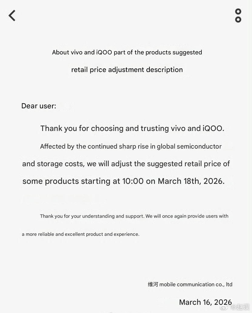 Dessutom har Vivo och dess undermärke iQoo meddelat att de kommer att höja priserna på utvalda enheter från och med den 18 mars i Kina. En tidigare läcka föreslog att nästa generations flaggskeppstelefoner från OnePlus, iQoo och Redmi med 2nm-chipset skulle kunna börja på 5 000 yuan (~725 USD). Prishöjningarna i Kina kan få konsekvenser även för globala marknader, även om ingen global prishöjning har tillkännagivits ännu.