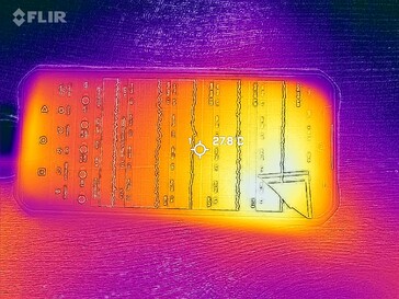 Det stora höljet tillåter dock SoC att avleda sin spillvärme ganska bra så chassit värms bara upp märkbart på några få ställen: vi uppmätte 34,3 ° C vid max. Detta är inte på något sätt kritiskt och därför är det inte förvånande att processorn och grafikenheten kan ge sin fulla prestanda utan problem även efter långvarig belastning. Detta framgår av 3DMark-stresstesterna.