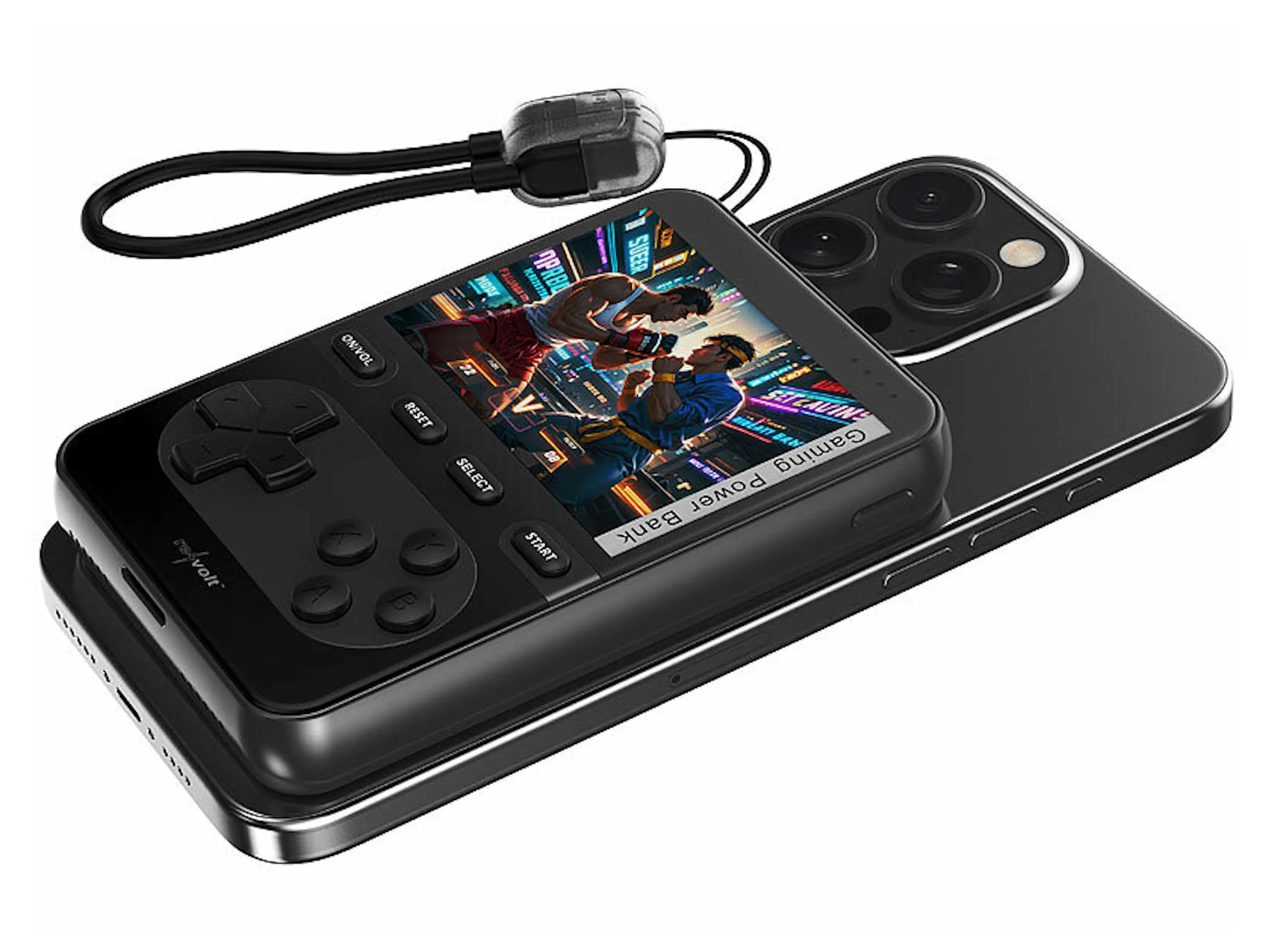 Powerbanken mäter ca 4,3 x 2,9 x 0,7 tum, väger 7 oz och har en 2,8-tums IPS-skärm. Den saknar joysticks men har en D-pad, fyra actionknappar och ytterligare knappar för menyåtkomst eller liknande. Gadgeten har också en kapacitet på 10.000 mAh, vilket borde räcka för ungefär 24 timmars spelande. Powerbanken kan dessutom mata ut upp till 20W via USB-C, vilket är tillräckligt för att ladda en smartphone snabbt men inte större enheter som en bärbar dator eller surfplatta. Den stöder också trådlös Qi-laddning med upp till 15W.