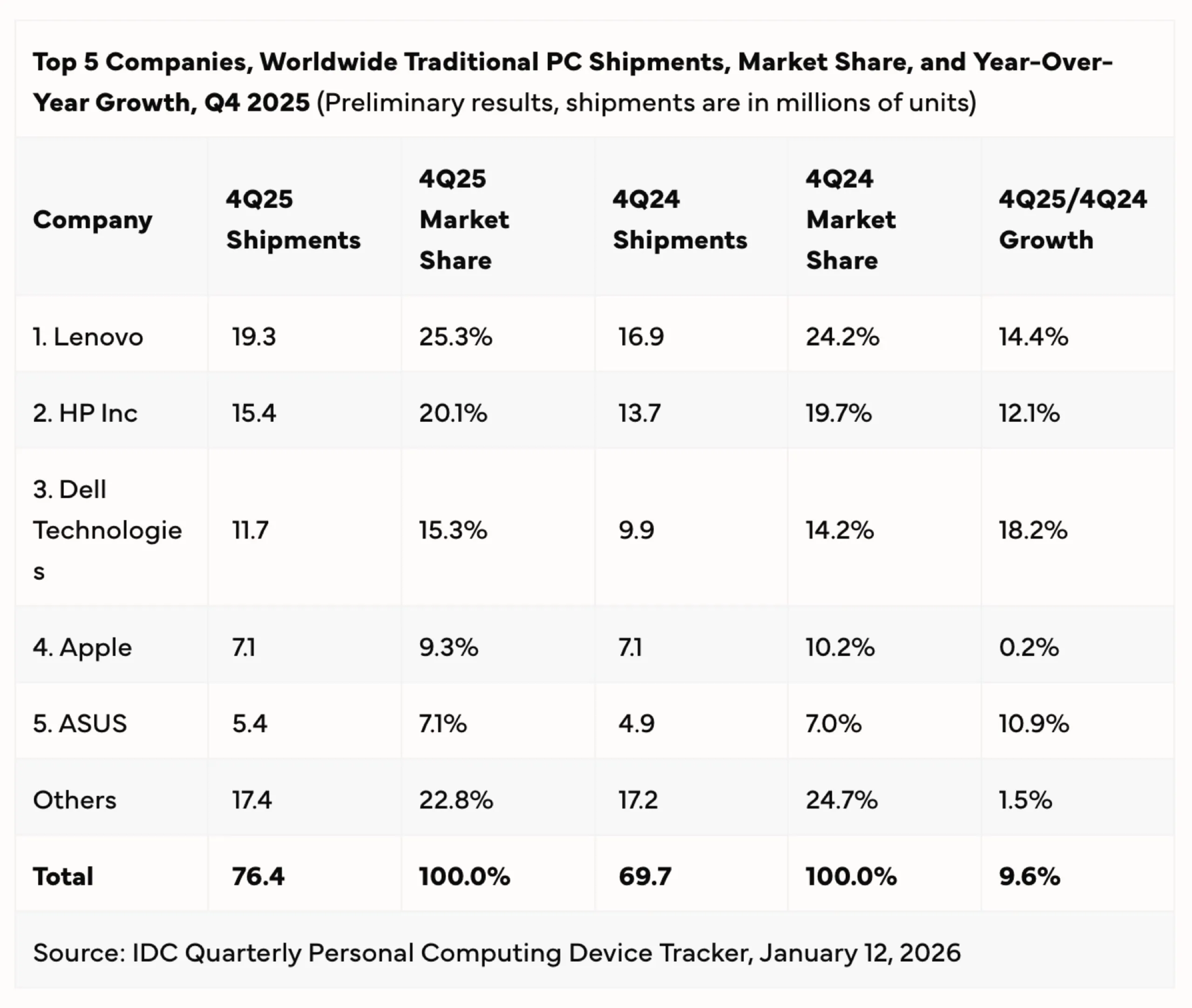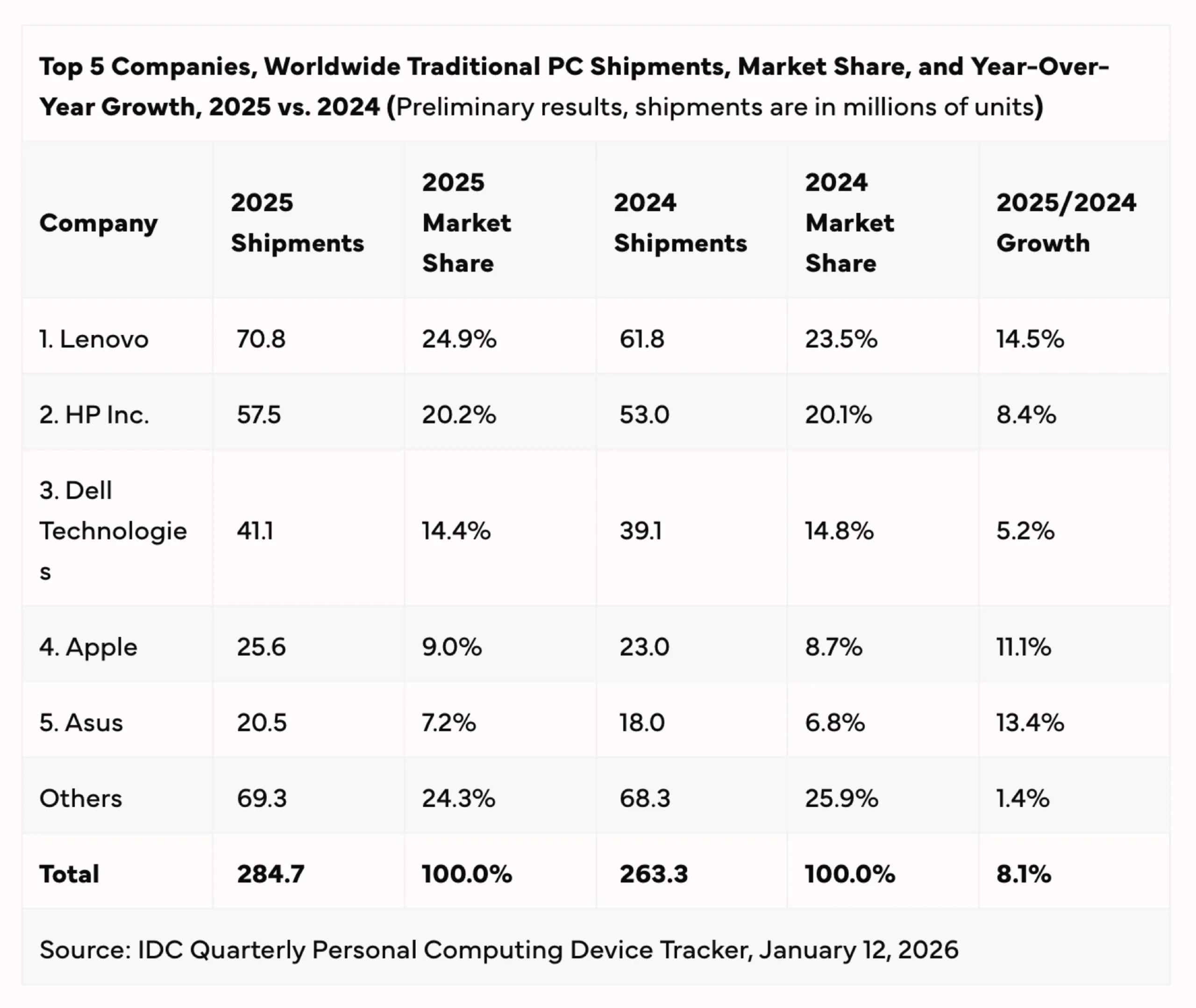 Enligt de senaste uppgifterna från International Data Corporation (IDC) växte den globala PC-marknaden med 9,6% under fjärde kvartalet 2025, med en total tillväxt på 8,1% för året, och nådde 284,7 miljoner enheter. Två faktorer är främst ansvariga för tillväxten under första halvåret: slutet på supporten för Windows 10, vilket fick många användare att uppgradera till en ny dator, och de amerikanska tullarna, som skapade osäkerhet hos konsumenterna.
