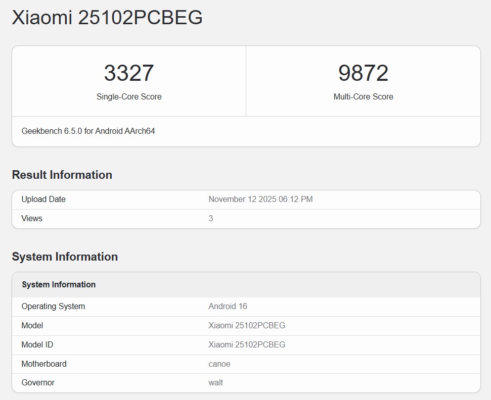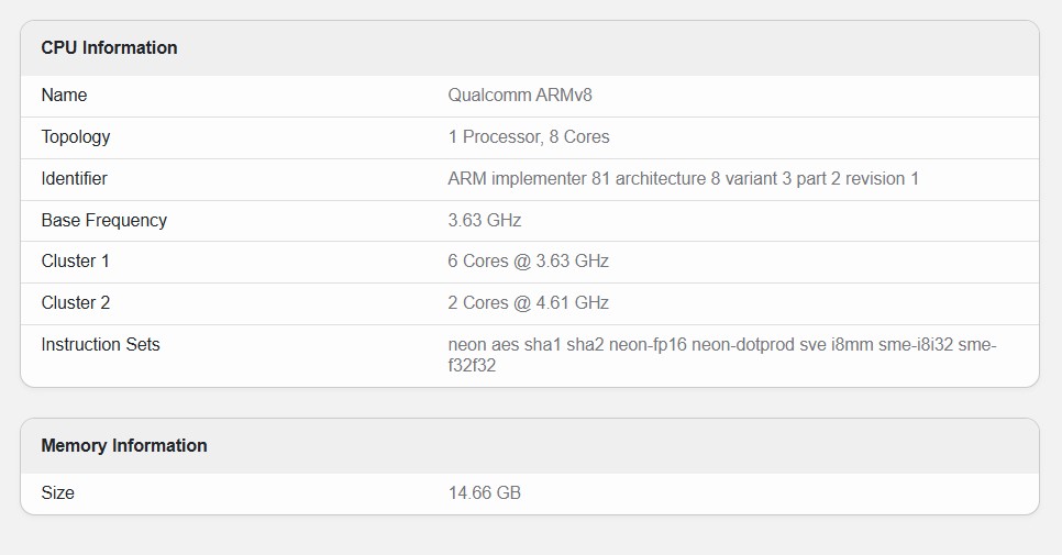 POCO F8 Ultra dök upp i Geekbench 6-databasen och fick poäng på 3 327 i enkärniga tester och 9 872 i flerkärniga tester. När man gräver i detaljerna bekräftar moderkortets kodnamn, "kanot", och CPU-klockhastigheterna (4,61 GHz för de två huvudkärnorna och 3,63 GHz för de återstående sex) att enheten kommer att skryta med den kraftfulla Snapdragon 8 Elite Gen 5-chip.