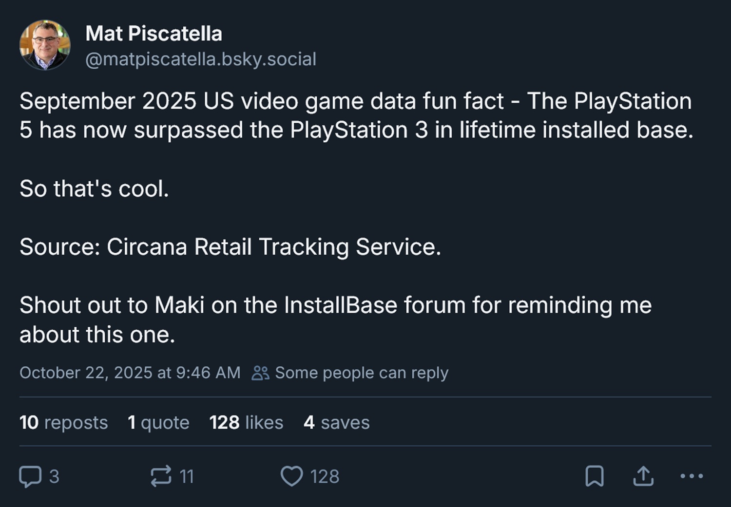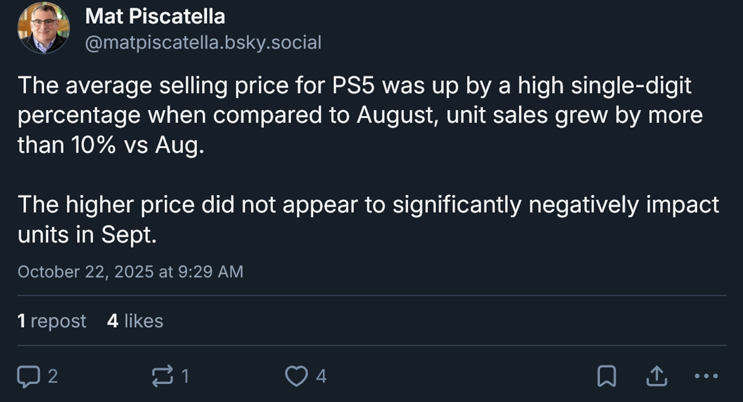 Matt Piscatella uppdaterade publiken med en serie Bluesky-inlägg. Han konstaterar att jämfört med augusti ökade "det genomsnittliga försäljningspriset för PS5 med ett högt ensiffrigt procenttal". Trots de högre MSRP:erna ökade enhetsförsäljningen med mer än 10% i september.