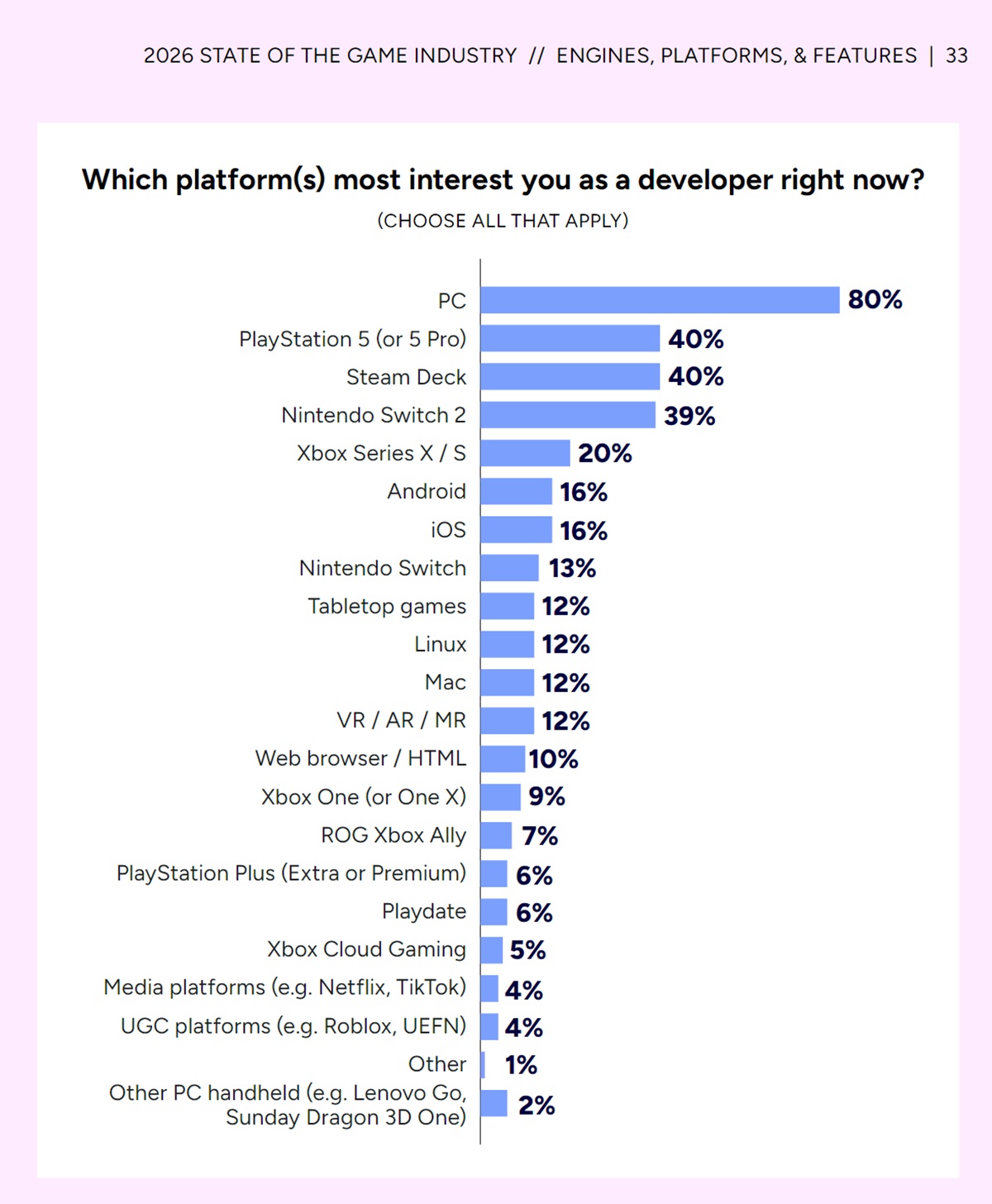 Som Video Games Chronicle diskuterar, över 2300 yrkesverksamma inom spelindustrin deltog i GDC undersökning. En fråga löd: "Vilken eller vilka plattformar intresserar dig mest som utvecklare just nu?" De tillfrågade fick välja flera alternativ, och med 80% var PC den tydliga vinnaren. PS5 och Steam Deck kommer därefter på 40%, följt av Switch 2 på 39%, med Xbox Series X|S på 20%.