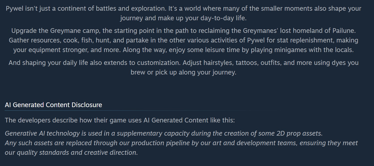 Steam-sidan Crimson Desert visar nu en ansvarsfriskrivning, enligt krav från Valve. Den lyder: "Generativ AI-teknik används i en kompletterande kapacitet under skapandet av vissa 2D-prop-tillgångar." Som med inlägget på sociala medier förklarar Pearl Abyss att dessa platshållarbilder bara ska vara tillfälliga.