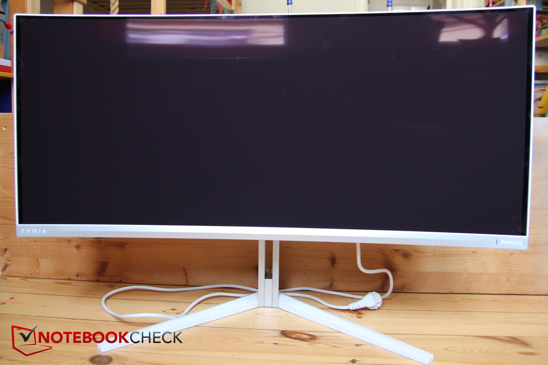 På framsidan antyder den mycket tunna plastkanten extremt tunna kanter, men i själva verket förblir en del av bildskärmsglaset alltid svart på framsidan. Överst är ramen knappt 1 cm bred, på sidorna redan 1,2 cm, underst är den silverfärgade ramen med EVNIA- (vänster) respektive Philips-logotypen och bokstäverna (höger) knappt 2,2 cm bred.